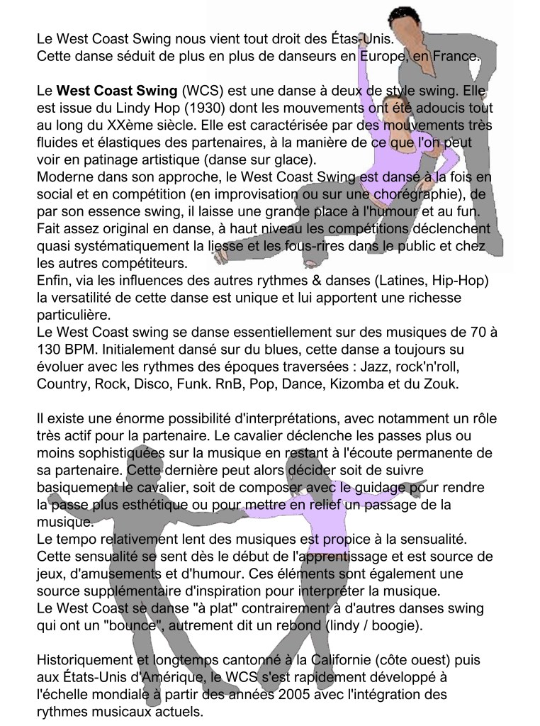 Vous souhaitez danser le WCS, danse fluide et souple qui laisse beaucoup de liberté d’interprétation pour le danseur comme pour la danseuse, alors venez aux cours de Juliette & François à la salle municipale de Toctoucau (1, Ae Georges Pelletier – Pessac), le jeudi